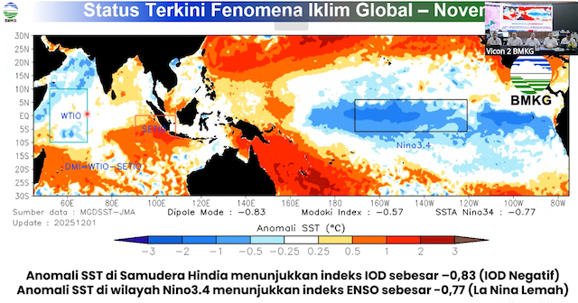 Deputi Bidang Klimatologi BMKG, Ardhasena Sopaheluwakan, menjelaskan bahwa kondisi iklim Indonesia saat ini dipengaruhi oleh kombinasi La Nina lemah dan Indian Ocean Dipole (IOD) negatif, yang berkontribusi terhadap peningkatan curah hujan di sejumlah wilayah.